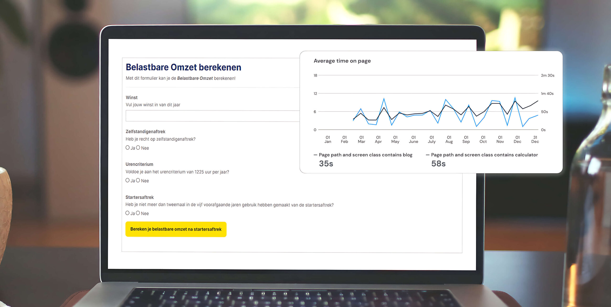 We zagen een stijging van 74% in de gemiddelde tijd die werd doorgebracht op elke pagina waar de calculator functionaliteit was ingeschakeld. De gemiddelde tijd op de pagina voor artikelen met calculators is 61 seconden, tegenover 35 seconden voor gewone blogartikelen. Dit zijn duidelijke tekenen dat de content nu relevanter is voor bezoekers.